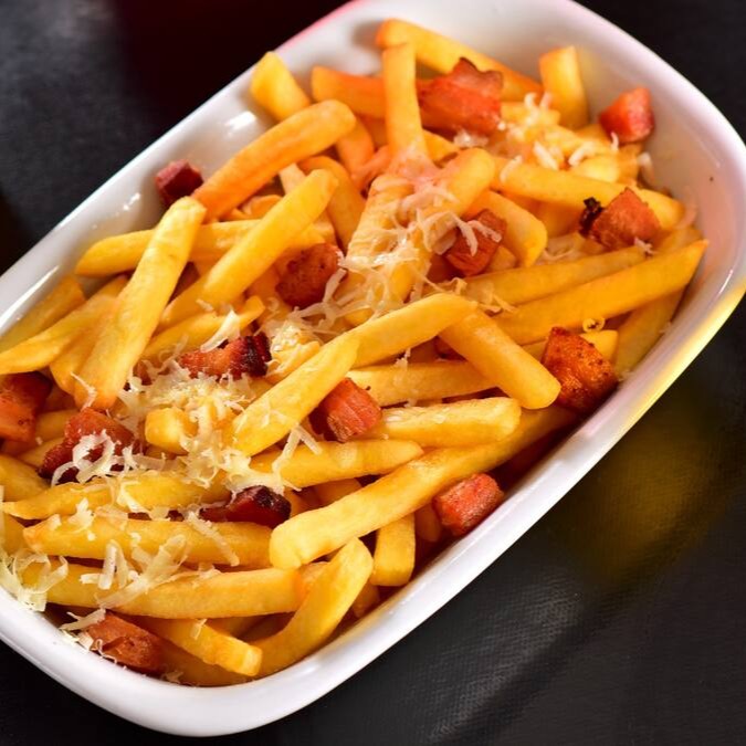 Bacon, presunto, mussarela, tomate, azeitona, batata palha.