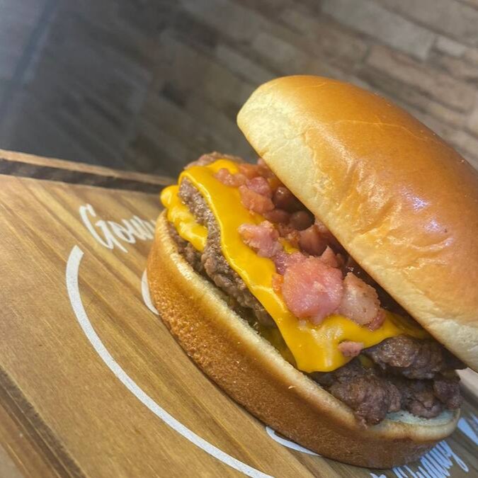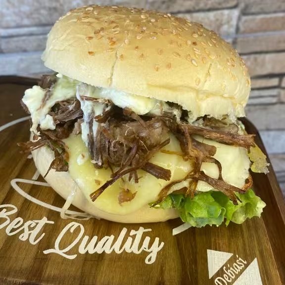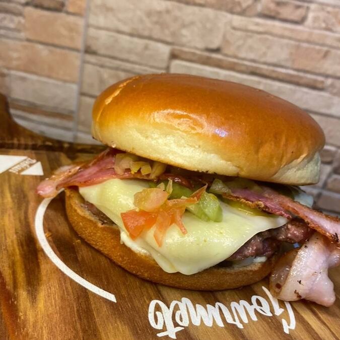 Pão brioche super macio selado na chapa, deliciosa maionse, hamburguer artesanal da casa, duas fatias de queijo cheddar, muuuuuito Catupiry, bacon em cubos e barbecue para finalizar.