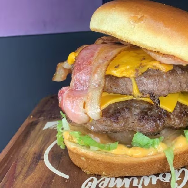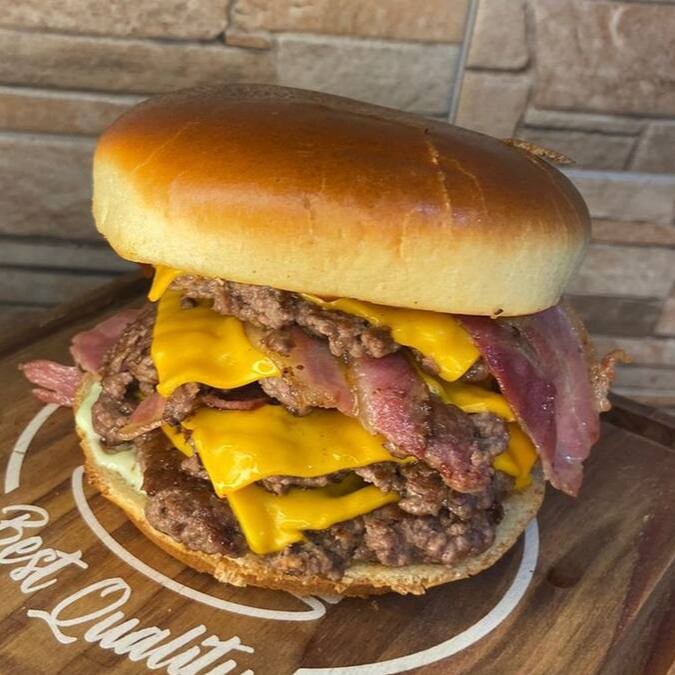 Pão brioche super macio selado na chapa, maionese, 2 hambúrgueres artesanais 60g, duas fatias de queijo cheddar, bacon em fatias e barbecue.