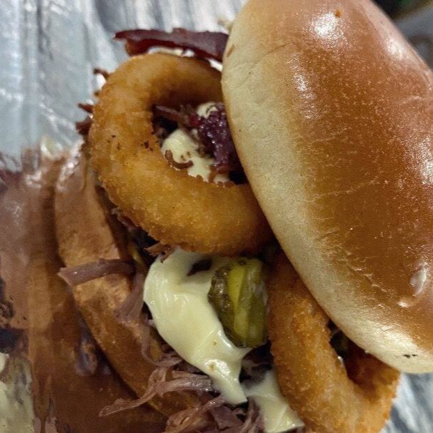 Pão brioche, maionese da casa, hamburguer artesanal 140g, queijo cheddar, costela desfiada, Catupiry, cebola empanada e peacles.