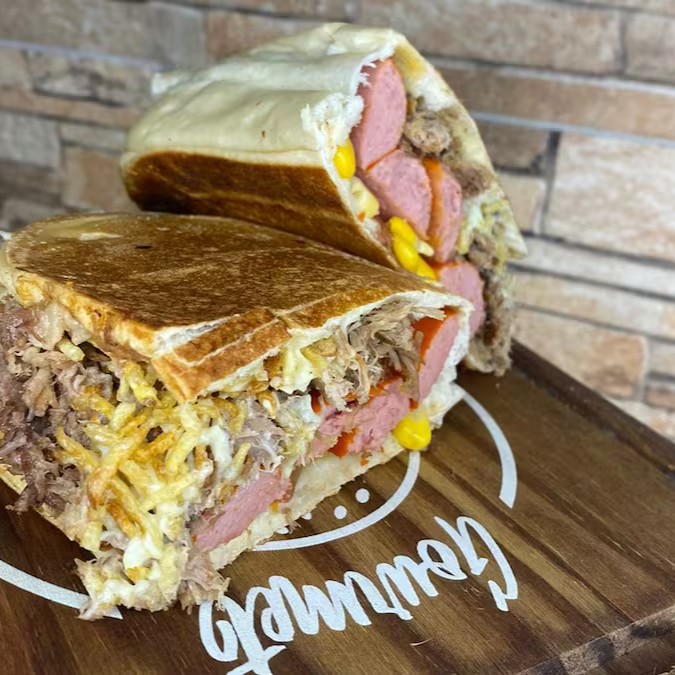 Pão tamanho especial selado na chapa, deliciosa maionese, hamburguer Aurora, costela desfiada, presunto, queijo mussarela derretido, alface e tomate fresquinho.