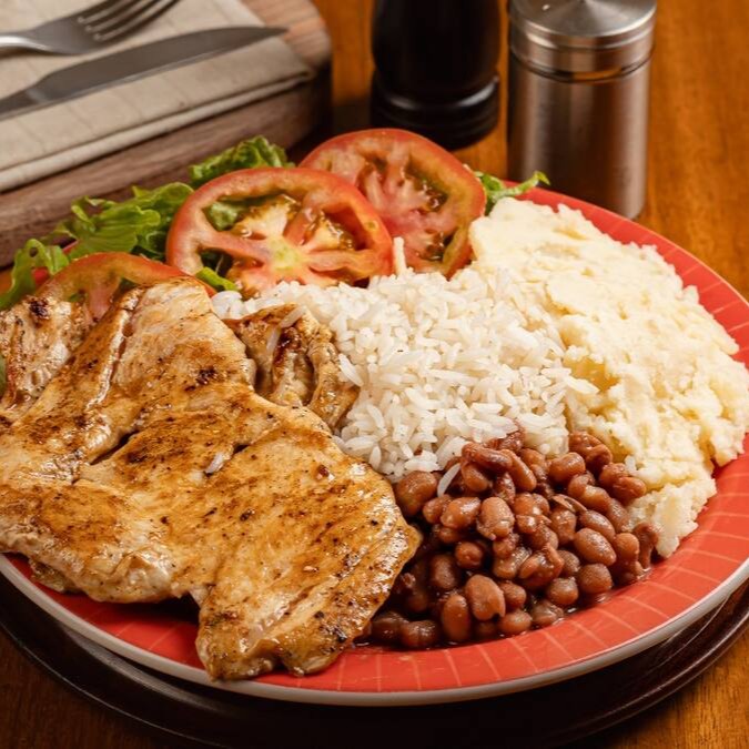 Delicioso 'Individual de Frango', a escolha perfeita para um almoço executivo ou como uma opção de marmita gourmet. Este prato inclui um suculento filé de frango cuidadosamente preparado, acompanhado de um arroz branco soltinho, um feijão caseiro riquíssimo em sabor, um purê de batata aveludado e uma salada fresca e crocante para equilibrar a refeição. Uma combinação perfeita de sabores e texturas que promete uma experiência gastronômica incrível.