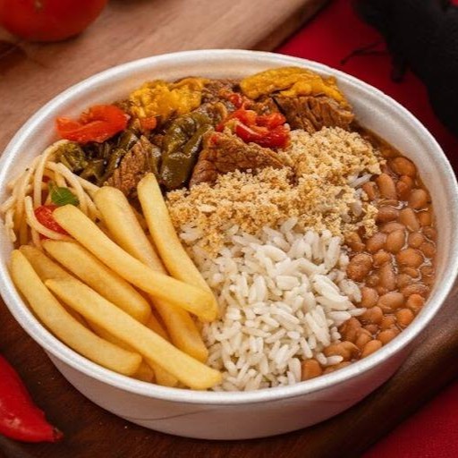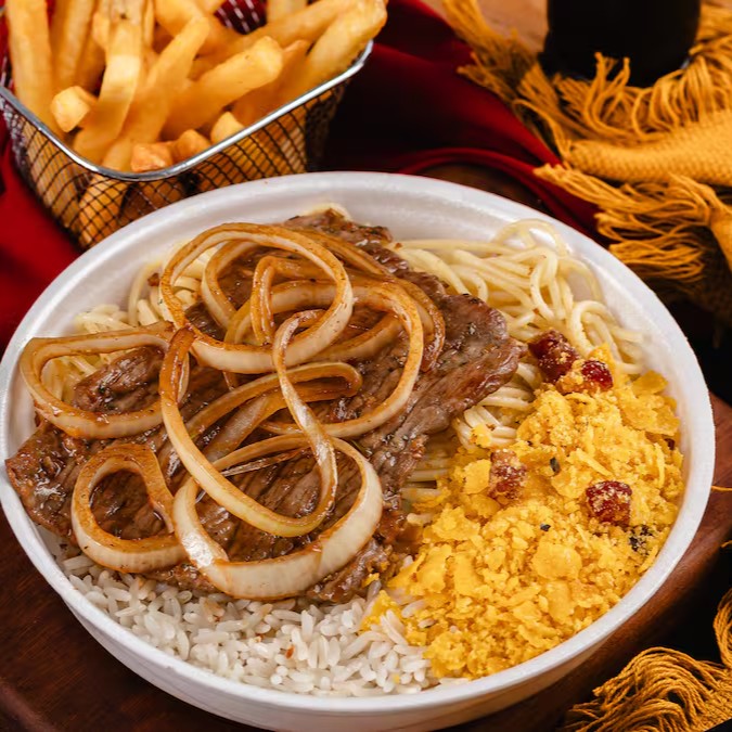 Arroz soltinho, feijão bem temperado, macarrão alho e óleo, farofa crocante, fritas crocantes e tiras de carne suculentas.