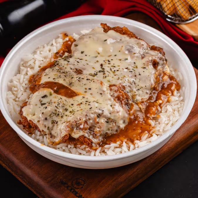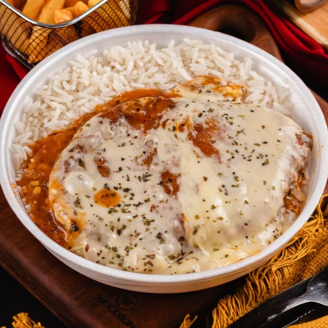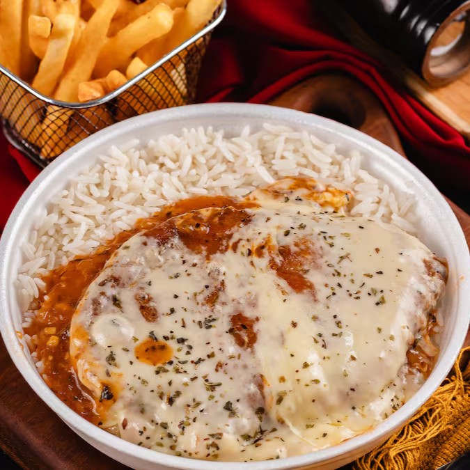 Arroz soltinho, fritas crocantes e filé de frango à parmegiana.