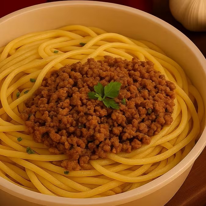 Delicioso macarrão alho e óleo e carne moída bem temperada.