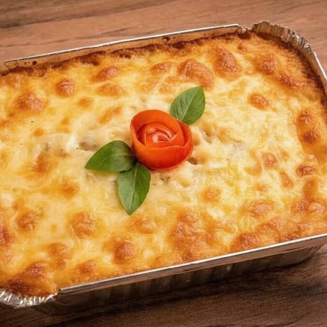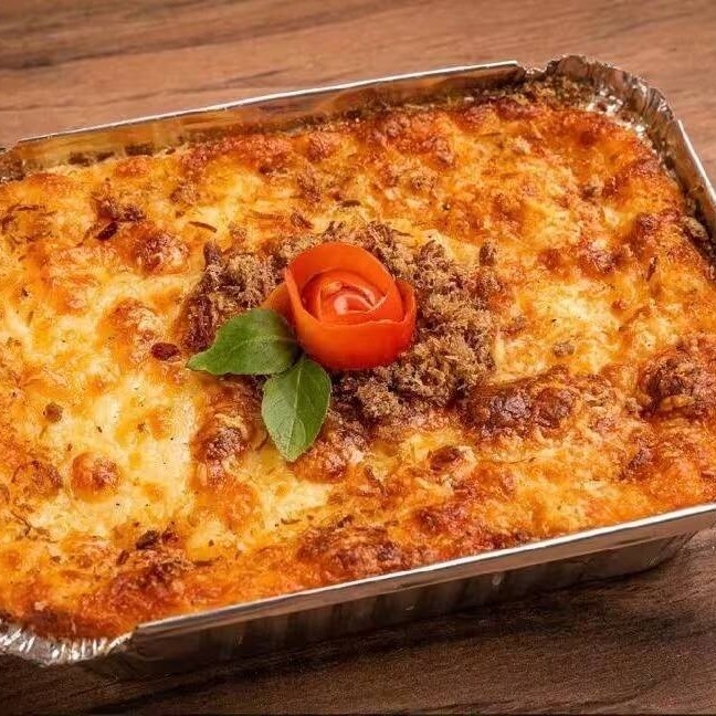 Delicioso purê de batata, recheado com carne suculenta, bem temperada e muçarela levemente gratinada.