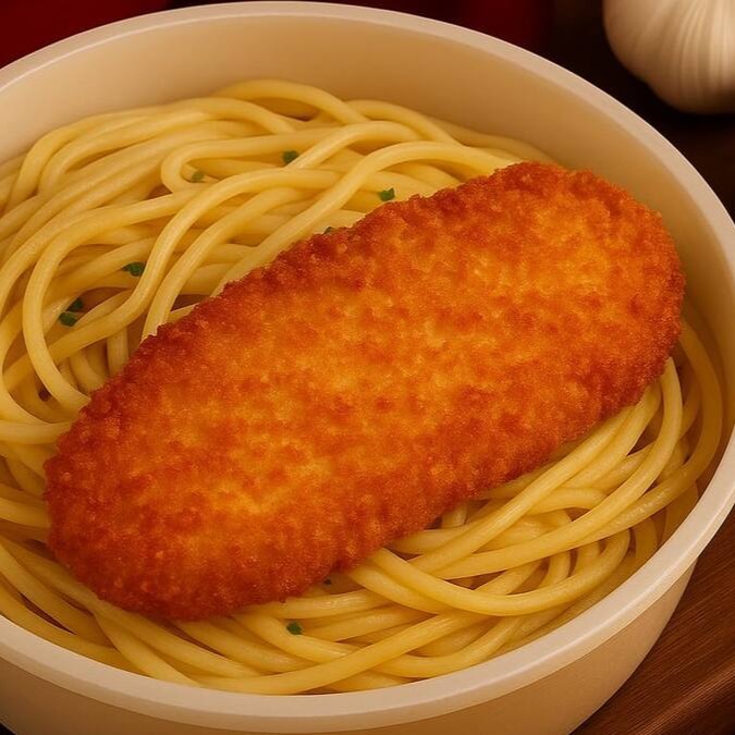 Delicioso macarrão alho e óleo e frango à milanesa douradinho.