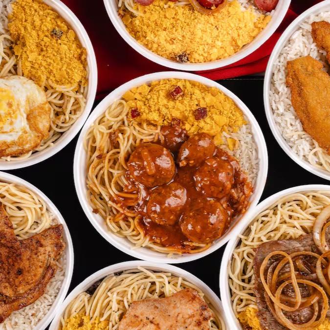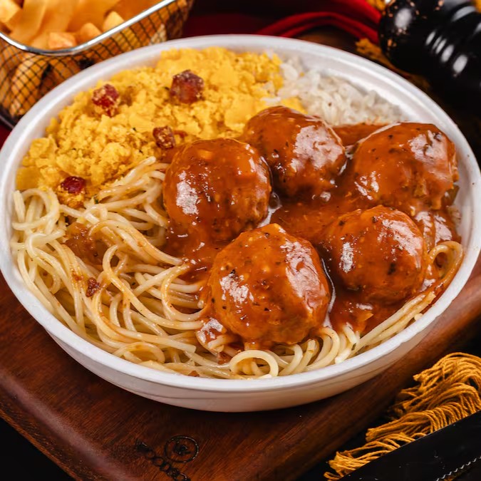 Arroz soltinho, feijão bem temperado, macarrão alho e óleo, farofa crocante, purê de batata cremoso e almondegas ao molho sugo.