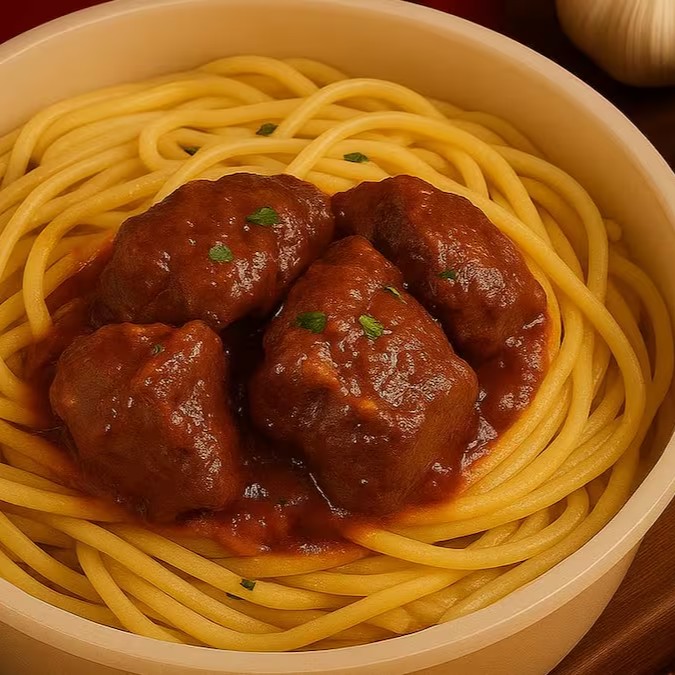 Delicioso macarrão alho e óleo e carne de panela suculenta.