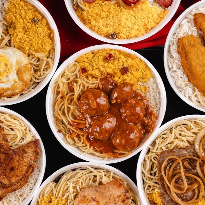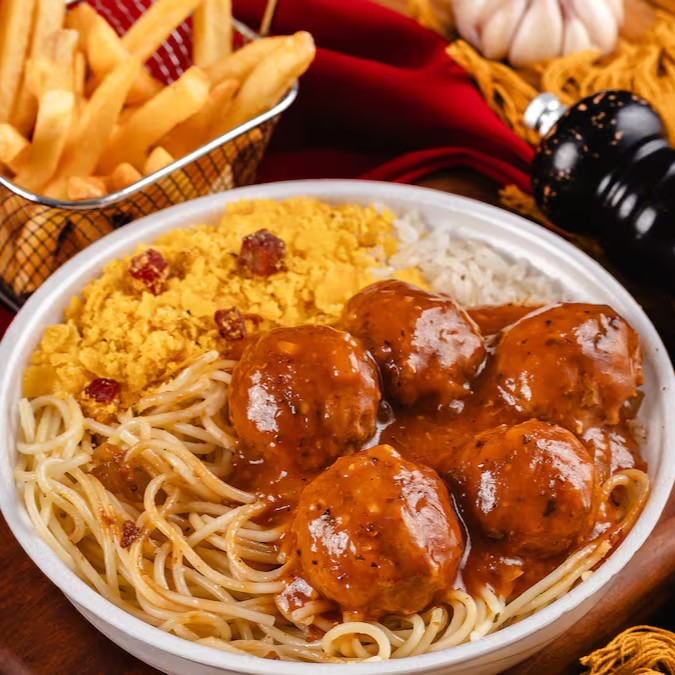 Arroz soltinho, feijão bem temperado, macarrão alho e óleo, farofa crocante, fritas crocantes e almondegas ao molho sugo.