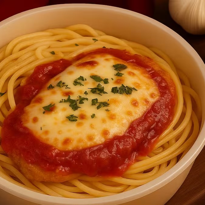 Delicioso macarrão alho e óleo e frango a parmegiana.