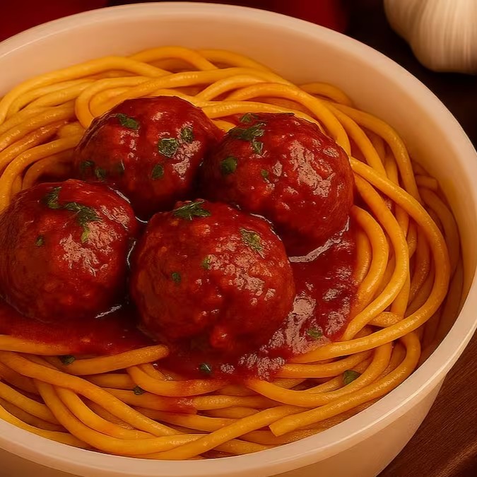 Delicioso macarrão alho e óleo e almondegas ao molho sugo.