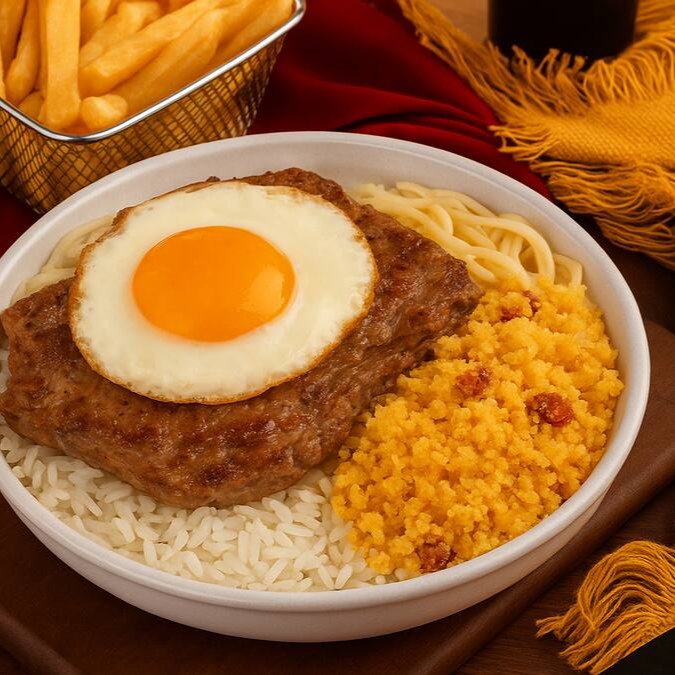 Arroz soltinho, feijão bem temperado, macarrão alho e óleo, farofa crocante, fritas crocantes e bife à cavalo.