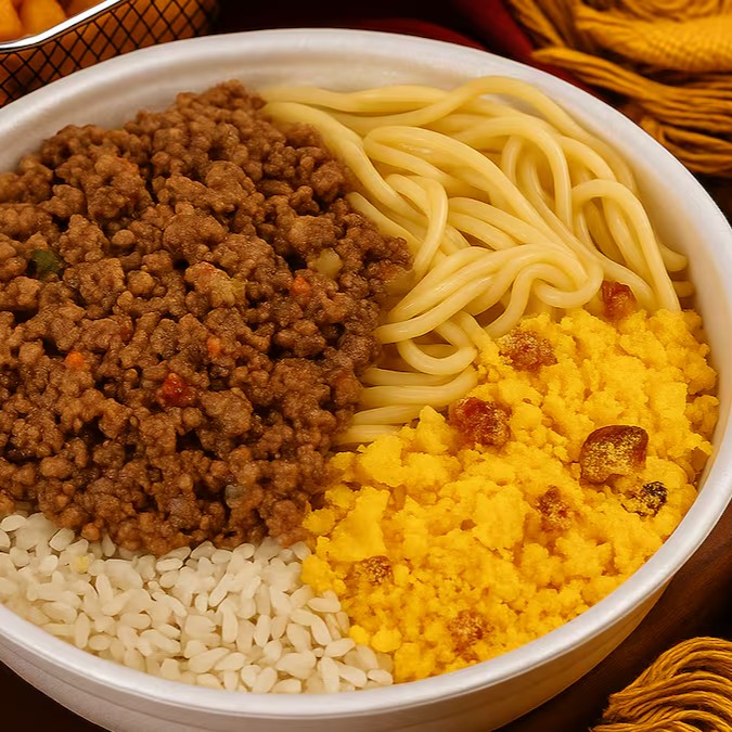 Arroz soltinho, feijão bem temperado, macarrão alho e óleo, farofa crocante, fritas crocantes e carne moída bem temperada.