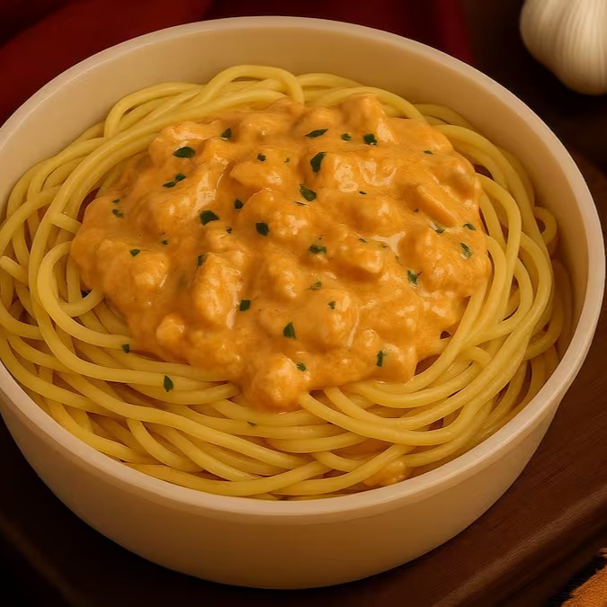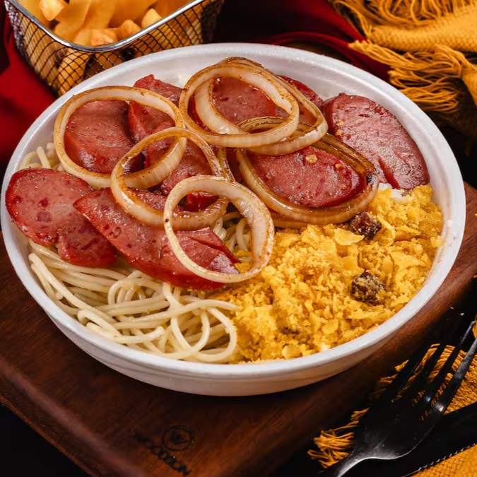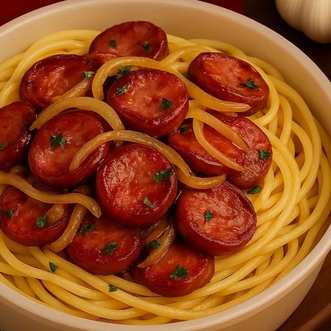 Delicioso macarrão alho e óleo e calabresa acebolada.