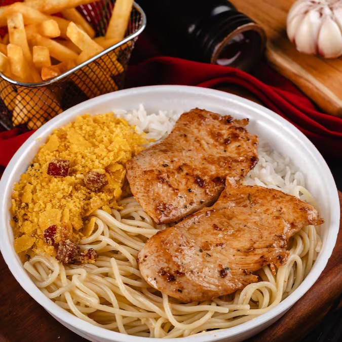 Arroz soltinho, feijão bem temperado, macarrão alho e óleo, farofa crocante, fritas crocantes e frango grelhado douradinho.