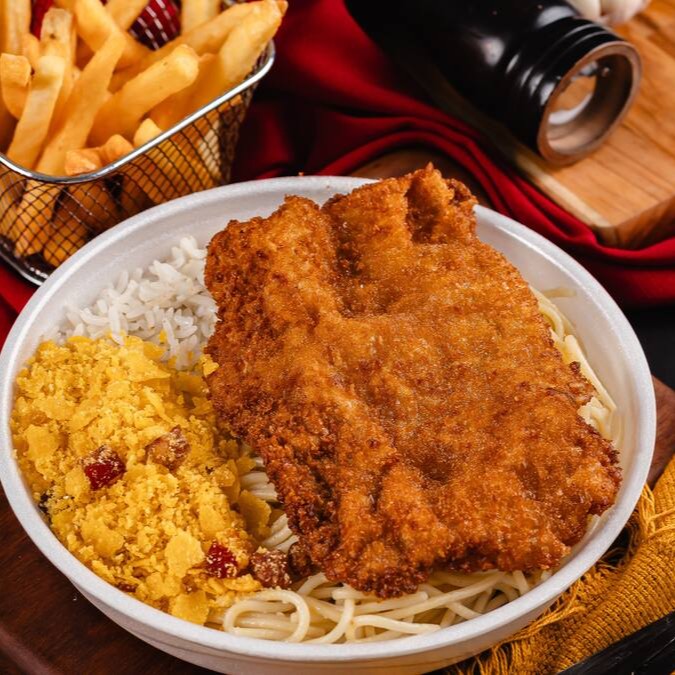 Arroz soltinho, feijão bem temperado, macarrão alho e óleo, farofa crocante, fritas crocantes e um bife à milanesa douradinho.