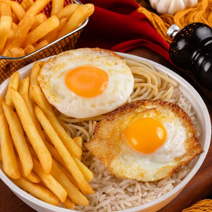 Arroz soltinho, feijão bem temperado, macarrão alho e óleo, farofa crocante, fritas crocantes e 2 ovos.
