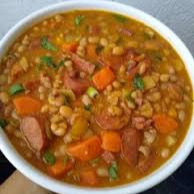 Caldo de feijão, bacon, arroz, cenoura, batata e calabresa.