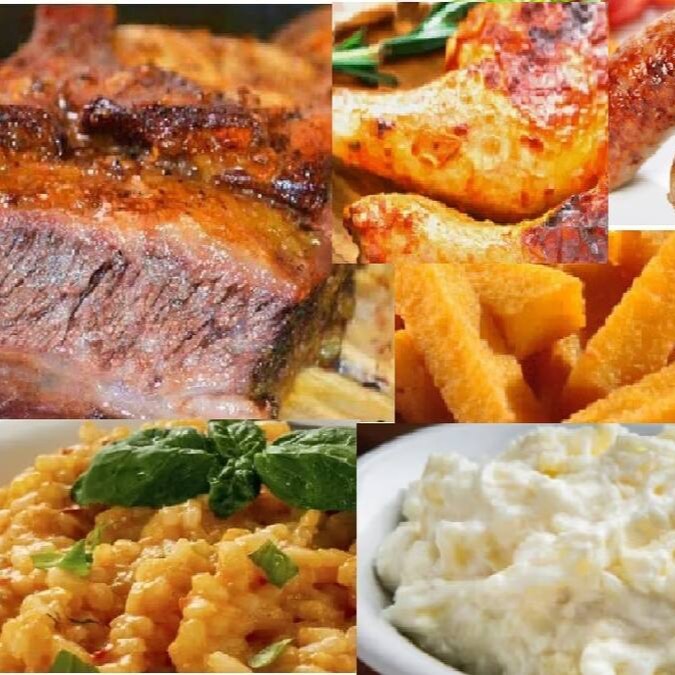 Costela 400g + 2 Sobrecoxa Frango + 2 Linguicinha + Risoto 750ml + Polenta 800ml + Maionese 500ml