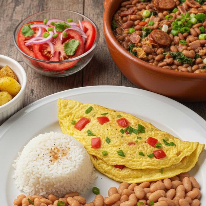 Arroz e feijão branco, macarrão ao sugo, tropeiro, e uma deliciosa omelete com tomate, temperos. Saladinha fresca.