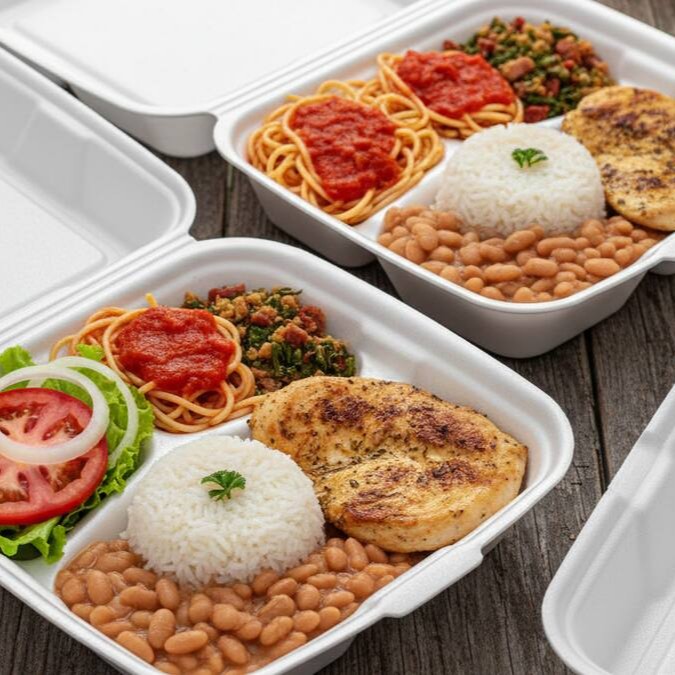 Arroz Branco, feijão Branco, macarrão ao sugo, frango grelhado e salada de tomate com cebola, acompanha o delicioso feijão tropeiro. , ideal para quem busca uma refeição leve e nutritiva. Tamanho M