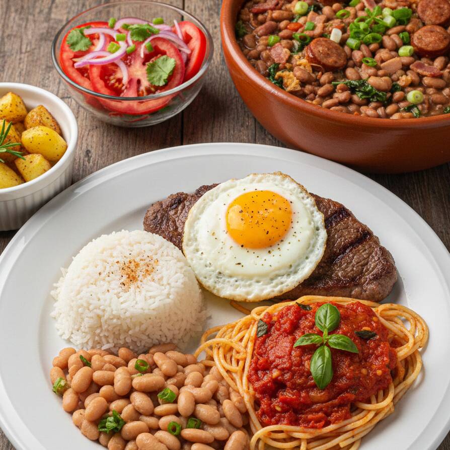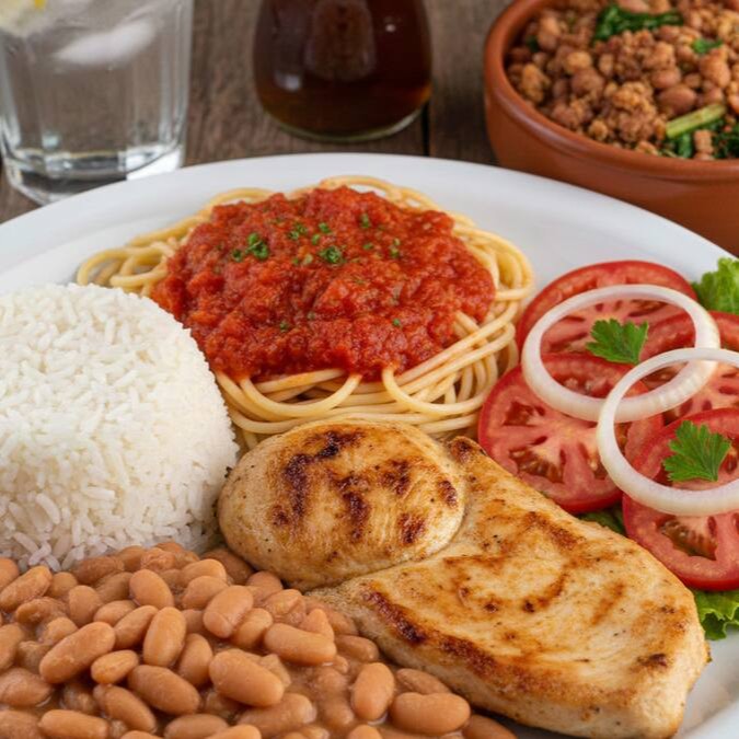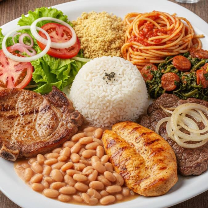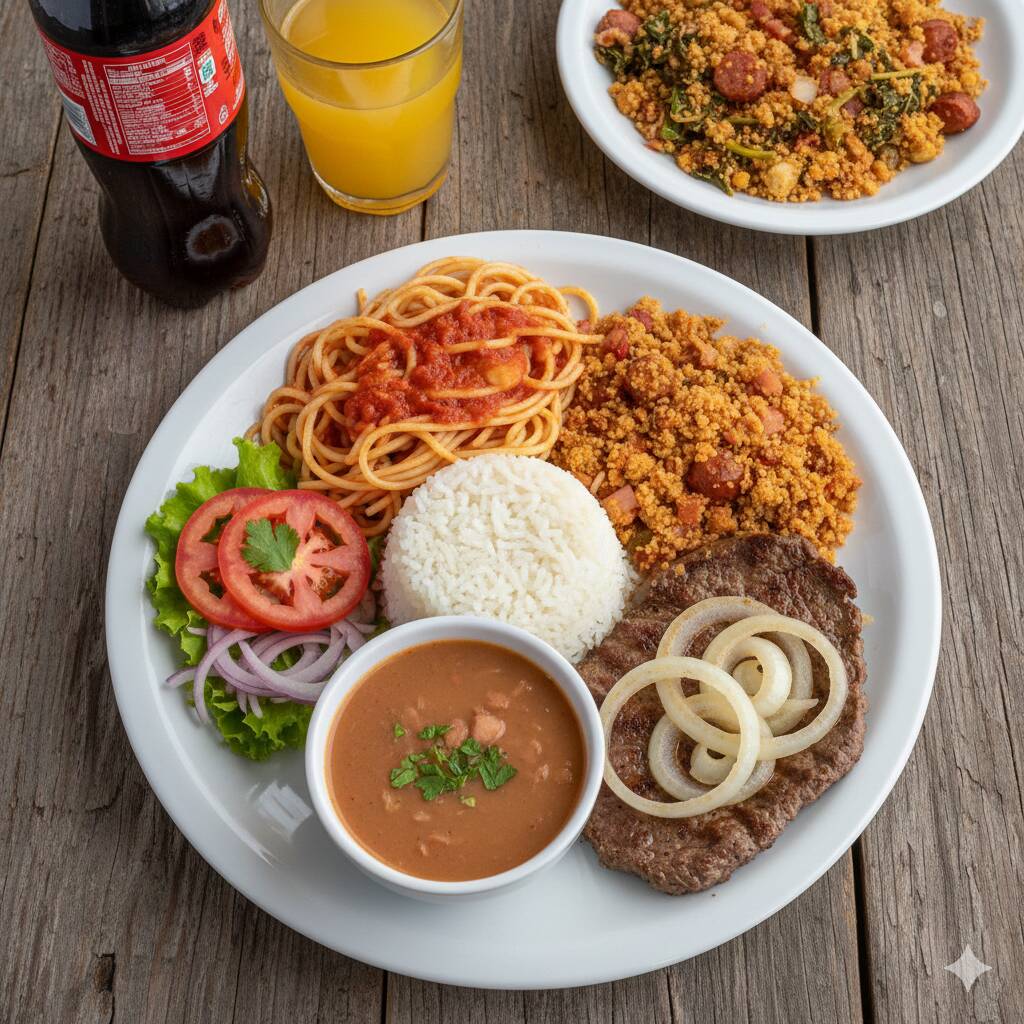 Arroz soltinho, feijão Branco temperado, macarrão ao sugo, bisteca suina, Feijão Tropeiro e salada de tomate e cebola. Um prato típico e saboroso.