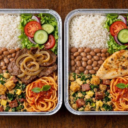 2 marmitas bife e peito de frango as duas acompanha tropeiro, arroz e feijão branco macarrão ao sugo e salada fresquinha.