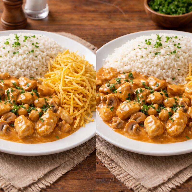 Arroz branco, delicioso estrogonofe de frango e batata palha.
