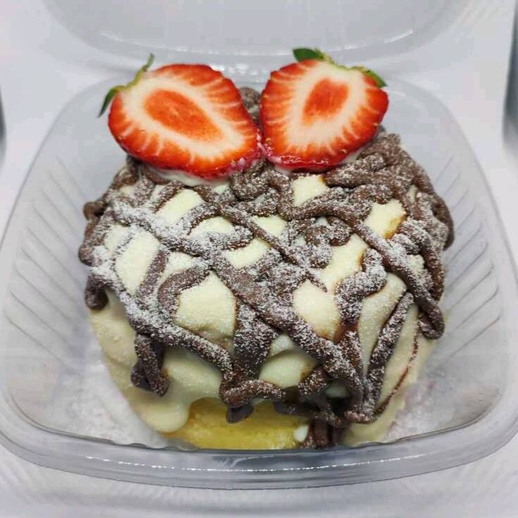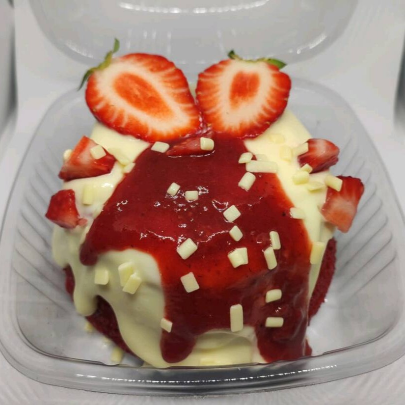Recheado no centro com geleia de morango e cream cheese coberto com uma calda cremosa de brigadeiro cremoso quentinha e finalizada com morangos in - nature Granulé Branco.