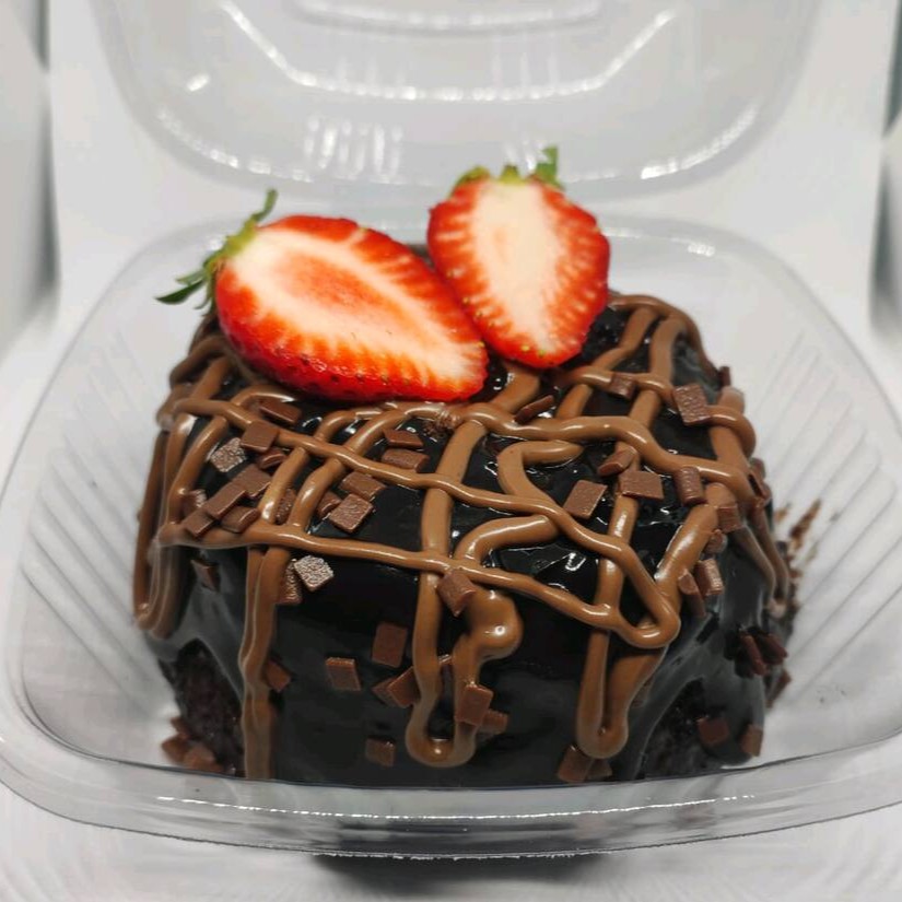 Uma Massa De Chocolate blend Molhadinho Que Desmancha Na Boca Recheado No Centro Geleia De Morango , Coberto De Brigadeiro Cremoso Quentinho , Fios De Creme De Avelã E Morango in - Natura. Servido quente.