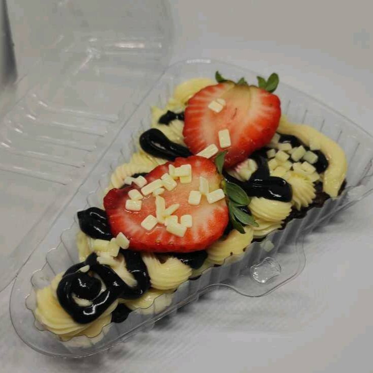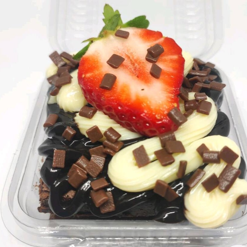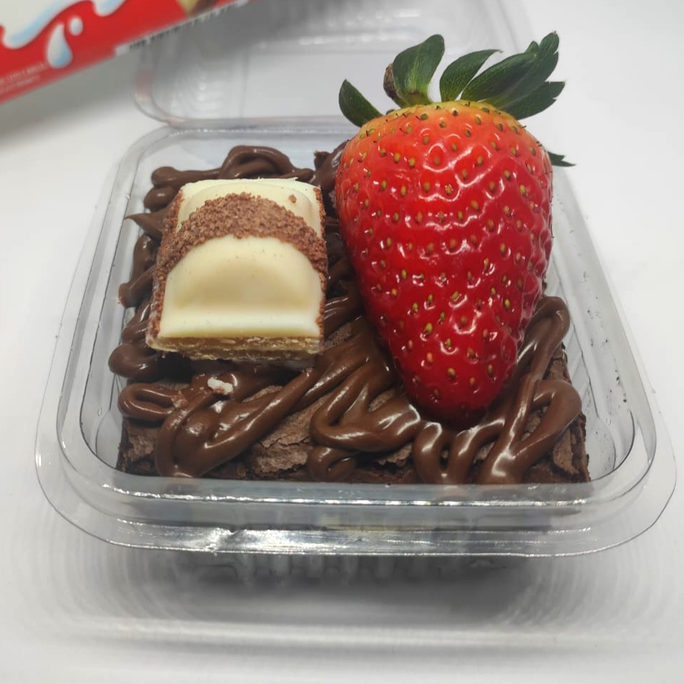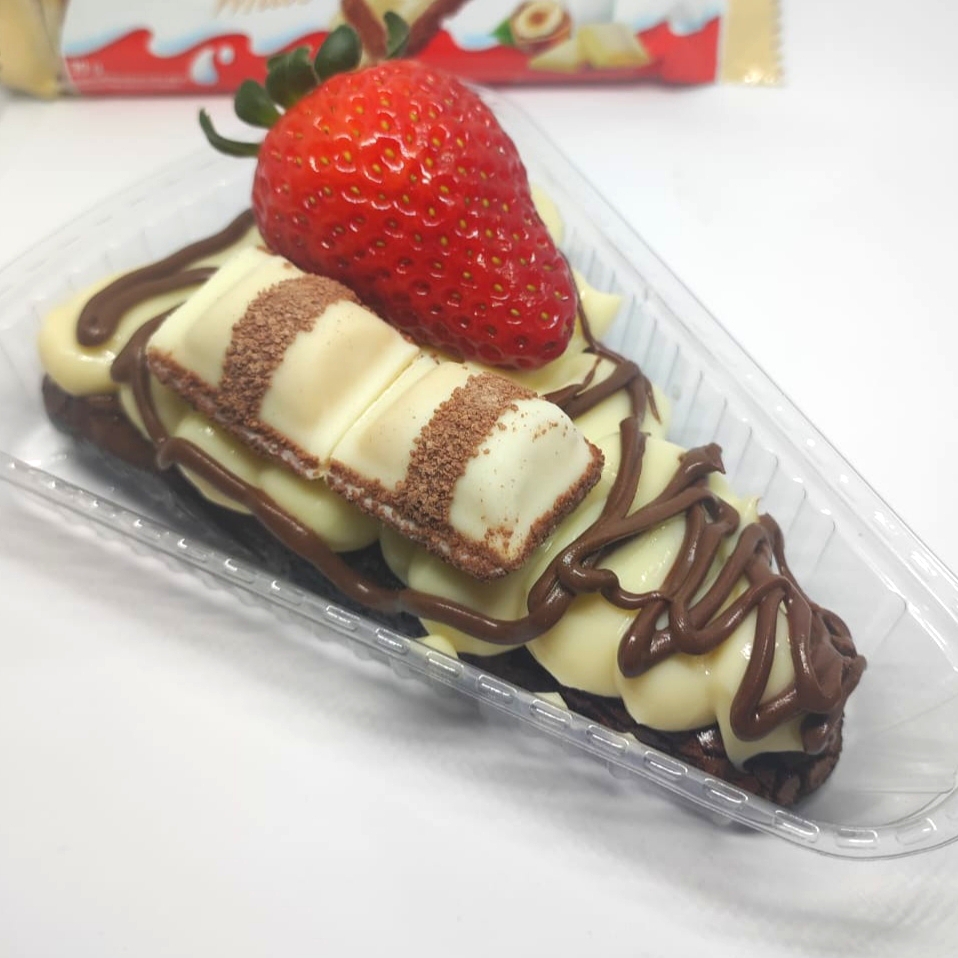 Nosso brownie será coberto com nosso recheio extremamente cremoso de brigadeiro branco cremoso, Ninho legítimo, também fios de creme de avelã e finalizado com morango.