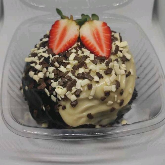 Recheado No Centro Com Morangos, Coberto Com Uma Calda Cremosa De Chocolate Branco E Preto Quentinha Finalizado Com Morango E Granulé.