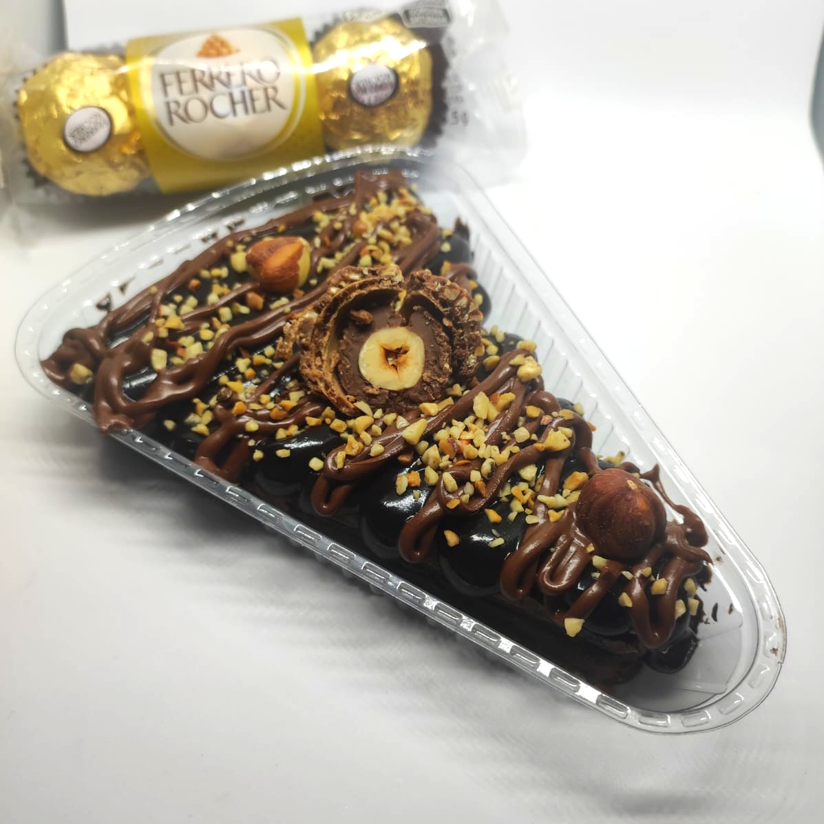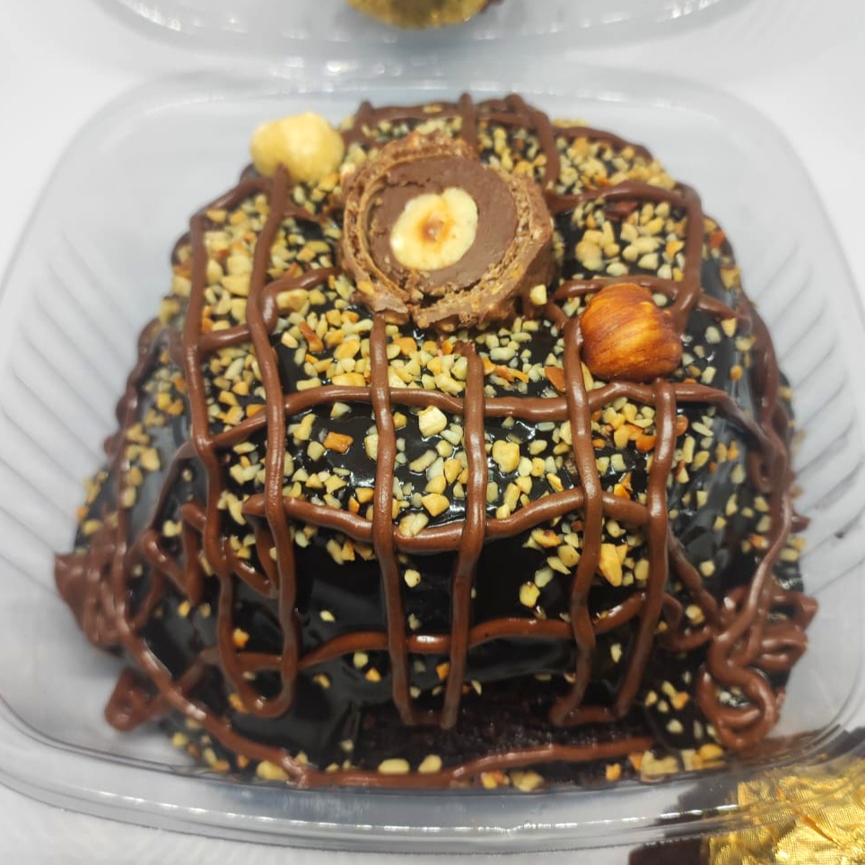 Trago uma releitura do bombom Ferrero Rocher, o bolo caseirinho é recheado no centro com creme de avelã e coberto de calda de brigadeiro blend.