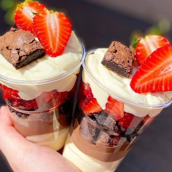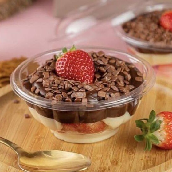 Camadas de creme de Ninho, Brownie molhadinho, recheado com morangos frescos e chocolate 50% 330 ml