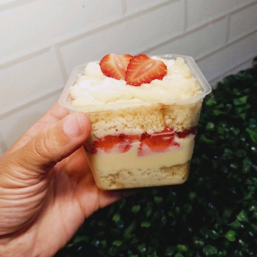 2 fatias de massa branca, feitas e umedecidas com leite, com recheio e cobertura de brigadeiro de Ninho e morangos naturais picados.
