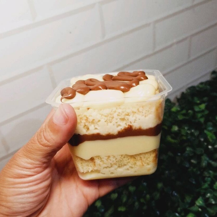 2 fatias de massa branca, feitas e umedecidas com leite, com recheio e cobertura de brigadeiro de Ninho e Nutella Original.