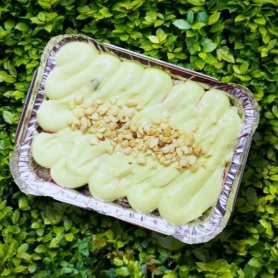 Massa branca, bem molhadinha, uma camada de geléia artesanal de frutas vermelhas (morango, framboesa, mirtilo e amora), coberta com brigadeiro cremoso de pistache. Peso aprox. 200g