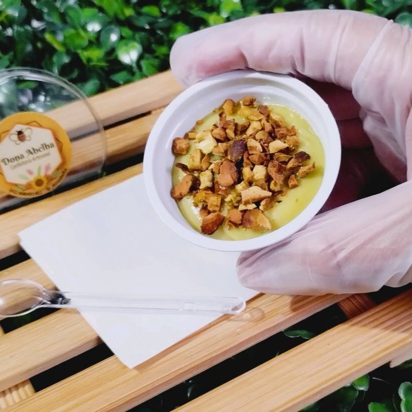 Esse potinho é a dose certa para quem quer comer um docinho sem culpa, pois possui 40g de Brigadeiro cremoso de Pistache, finalizado com xerém de pistache torrado.