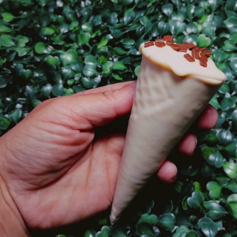 Casquinha de biscoito crocante com cobertura sabor chocolate branco, recheada com brigadeiro de Ninho cremoso e 2 camadas de Nutella Original