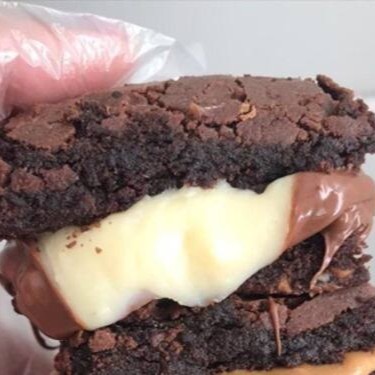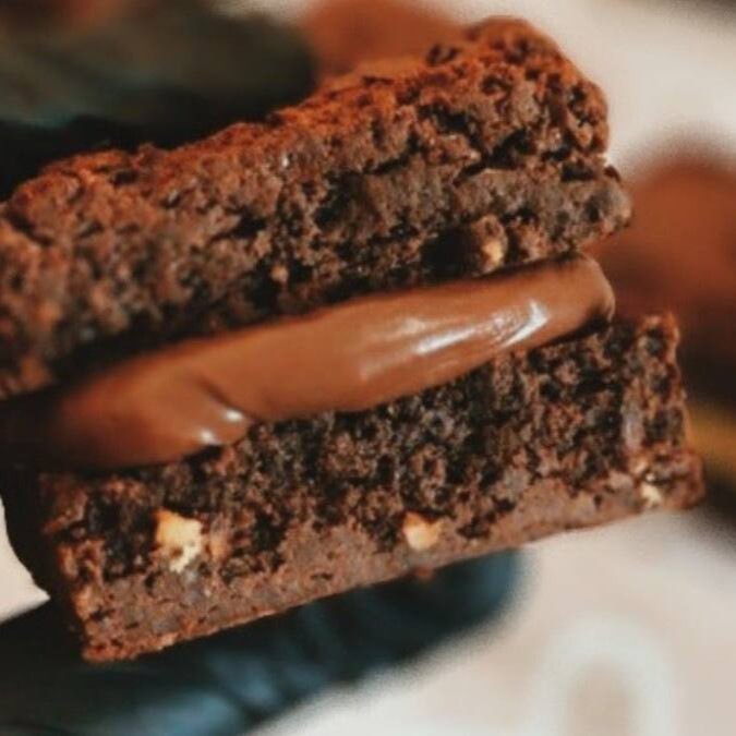 Sanduíche de brownie macio, recheado com creme de leite Ninho e creme de avelã, uma combinação irresistível.