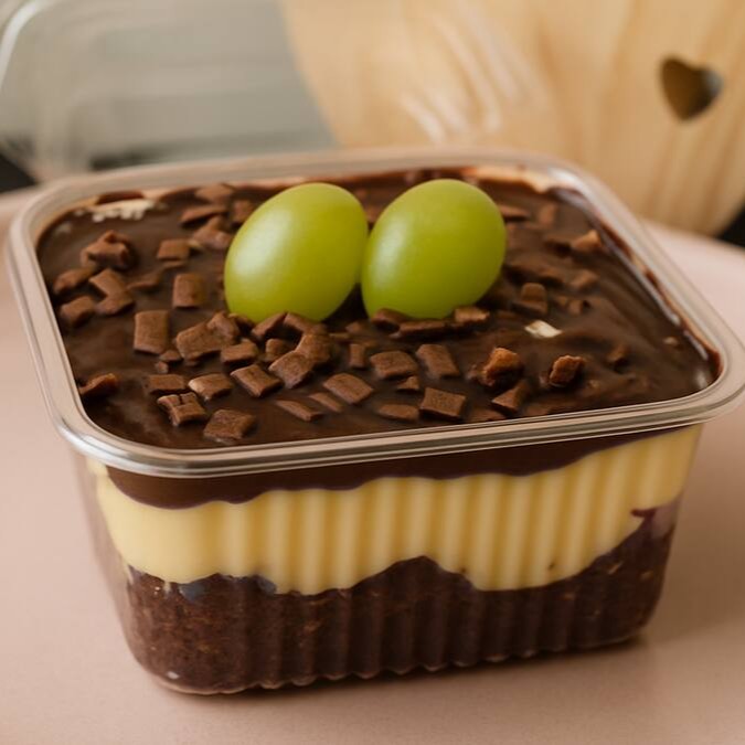 Camadas de creme branco leve e aveludado, uvas fresquinhas e suculentas, e uma cobertura generosa de ganache de chocolate meio amargo. Montado no potinho, essa versão do clássico bombom de uva combina frescor, cremosidade e o contraste perfeito entre o doce e o frutado. Uma sobremesa refrescante, elegante e viciante!