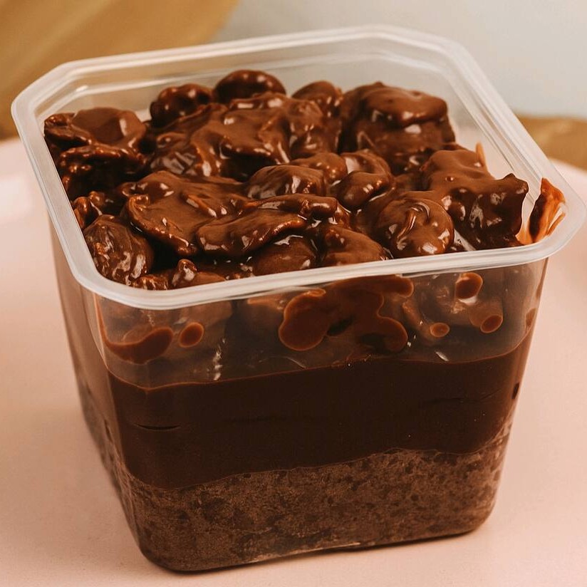 Esse e o Bolo do Momento, uma explosão de sabor e textura! Nosso Crunch Cake é um bolo no pote feito com camadas de bolo de chocolate 50% úmido e cremoso, intercaladas com Recheio de chocolate aveludado que derrete na boca e finalizado com uma generosa cobertura de chocolate crocante com Sucrilhos. Cada colherada combina maciez, cremosidade e crocância em perfeita harmonia.