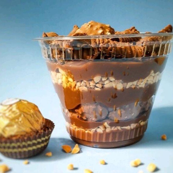 Copo Brownie Ferrero Rocher Uma explosão de sabor! Camadas generosas de brownie artesanal bem úmido, creme de avelã cremoso, ganache de chocolate, pedaços crocantes de amendoim . Uma sobremesa intensa, sofisticada e irresistível, feita para os amantes de chocolate e avelã.