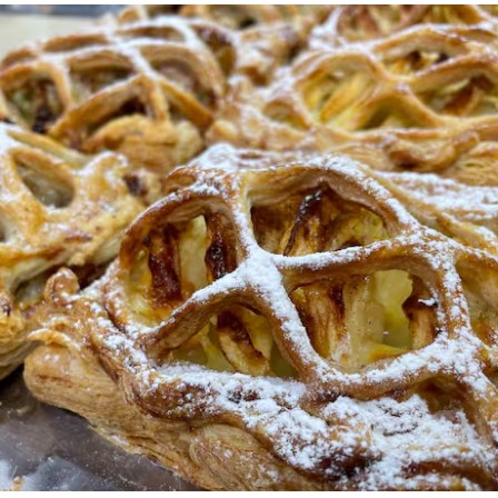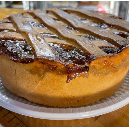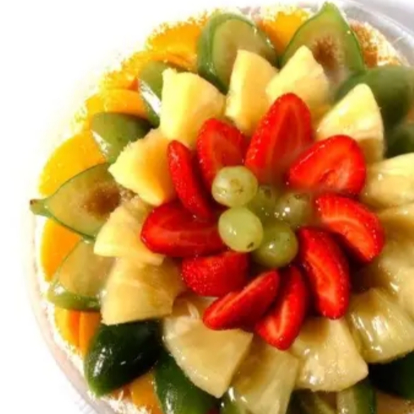 Torta gelada com creme de baunilha no recheio e frutas sortidas na cobertura. Peso Aproximado 1,400kg. (As frutas usadas são morango, uva, pêssego, abacaxi, figo, kiwi, ameixa ou carambola e variam em cada torta. Não é possível alterar nenhuma fruta.)