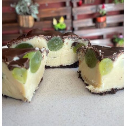 Tortelete com massa de biscoito Oreo, recheado com brigadeiro branco e uva verde sem semente, coberto com ganache.