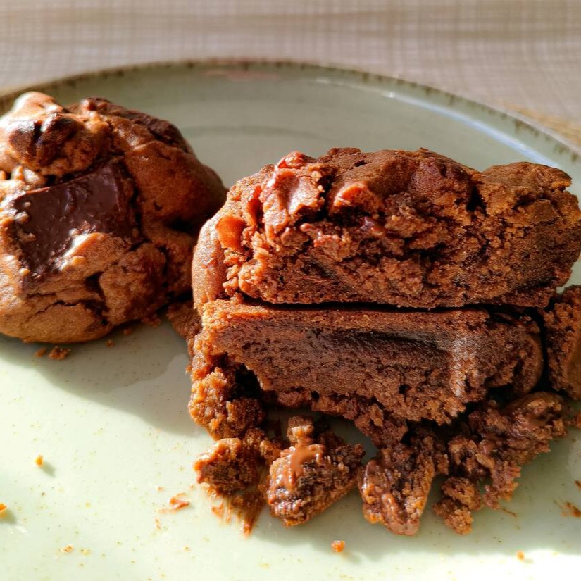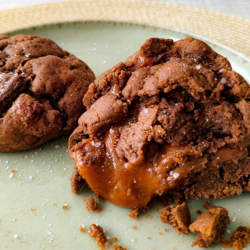 Cookie requintado feito com cacau 100% e chocolate meio amargo, recheado com brigadeiro de caramelo salgado e finalizado com flor de sal.