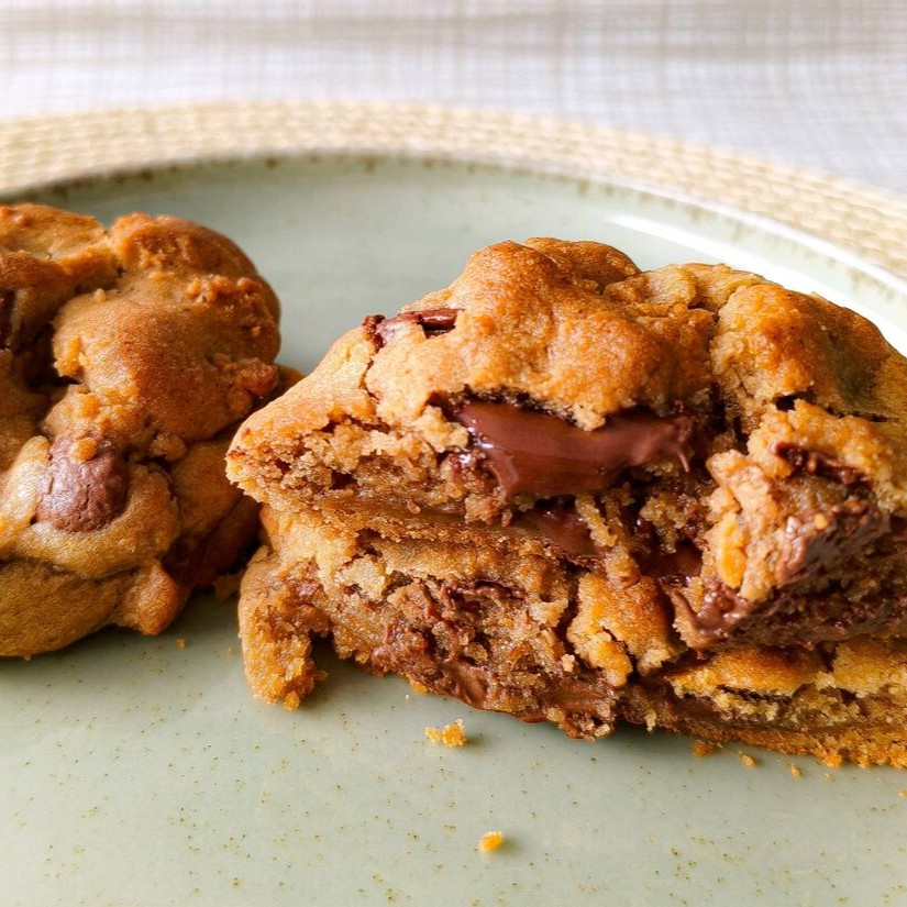 Cookie vibrante recheado com um brigadeiro cremoso de Ninho e muitas gotas de chocolate branco.