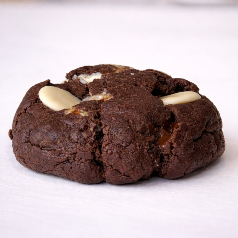 Cookie na massa Cacau Black. Cada mordida entrega um equilíbrio incrível de sabores: o amarguinho elegante do chocolate preto com a cremosidade doce do chocolate branco, resultando em uma experiência sofisticada e totalmente viciante. Um cookie marcante para quem ama chocolate de verdade!