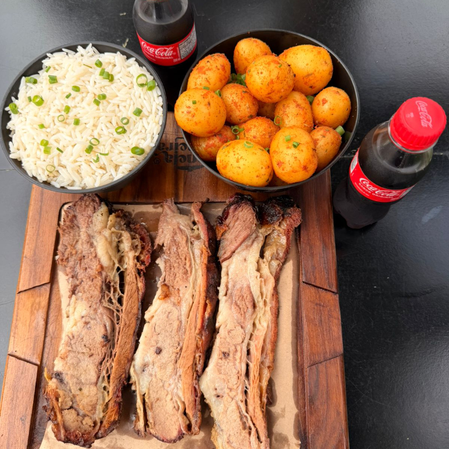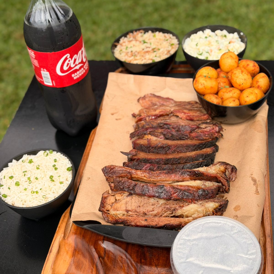 600g de Costela bovina suculenta assado na brasa estilo fogo de chão 300g de Brisket Texano 300g de Cupim Defumado Texano 500g maionese gourmet com leve sabor de limão siciliano 400g Arroz branco soltinho 500 Risoto de costela desfiada 600g Batatas caribenhas, com temperos tropicais 250g Farofa crocante 1 coca cola geladinha 2l
